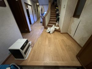 高さが上がる分、ドアのアンダーカット、框上貼り等工夫をし、1階のお部屋の段差がなくなる様に工事いたしました。